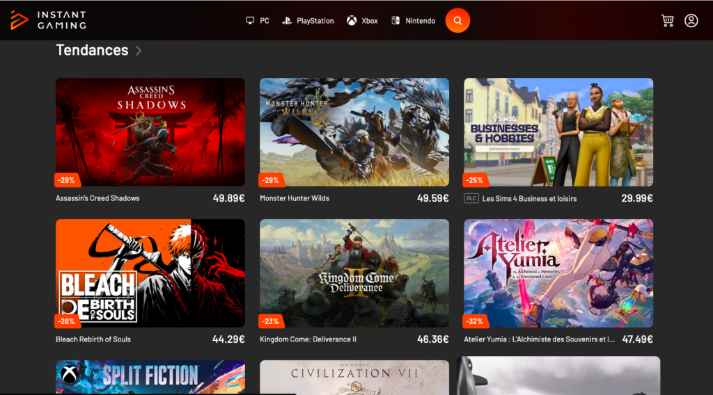 Mon Dieu, quelle différence ! Quand les plateformes officielles affichent 66,79€ pour les nouveautés, Instant Gaming casse les prix avec des réductions de 20% à 50%.